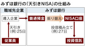 少額投資非課税制度(NISA)の利用者を職場単位で勧誘する「職域営業」で、みずほ銀行が新手法を編み出した。給与からの天引きで投資信託を積み立てられるシステムを開発。企業や事業所の従業員がNISA口座で投信を毎月購入できる仕組みだ。初の導入企業となったのは殺虫剤大手のフマキラー。小口投資家が中心のNISAだが、企業単位でアプローチすれば一度に多くの顧客を獲得できるチャンスもある。「天引きNISA」もその一つとして注目されそうだ。