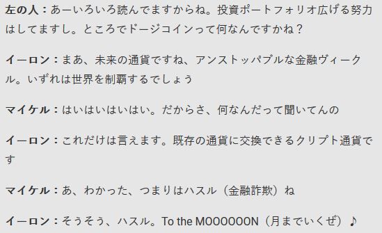 ドージコインはイーロンの冗談から生まれた通貨で、2013年に2人のギークが仮想通貨の騒ぎを面白がって開発したら買いが集中し今にいたります。そのドージコインが番組前の金・土には時価総額900億ドル(約9.8兆円)にも達したんですね。こんなことはアメリカのTV史上でも例がありません。