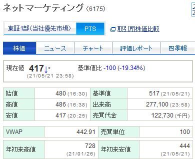 ネットマーケティング(6175) 517円 −15円 (−2.82%)