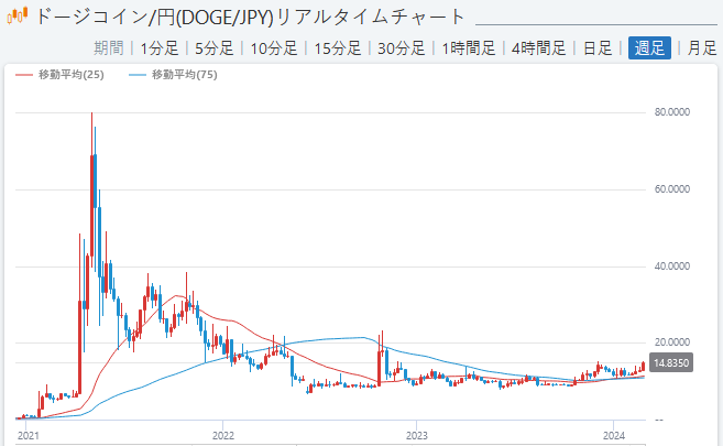 ドージコイン 14.9240円 +0.7090円 (+4.98%)