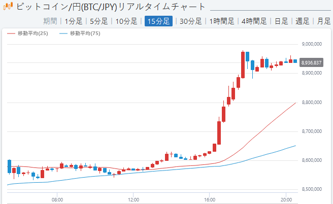 ビットコイン 8,960,000円 +442,407円 (+5.20%)
