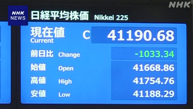 日経平均4日ぶり反落 終値1033円安の4万1190円