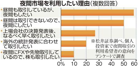 Åìµþ¾Ú·ô¼è°ú½ê¤Ï¡¢Ìë¤Î»þ´ÖÂӤ˳ô¼°¤ÎÇäÇ㤬¤Ç¤¤ë¡ÖÌë´Ö¼è°ú»Ô¾ì¡×¤Ë¤Ä¤¤¤Æ¡¢Áᤱ¤ì¤ÐÍèǯ½©¤Î³«ÀߤòÌܻؤ·¤Æ¸¡Æ¤¤ò¿Ê¤á¤ë¤³¤È¤Ë¤Ê¤ê¡¢º£·î¤«¤é¹ñÆâ³°¤ÎÅê»ñ²È¤Î°Õ¸þ¤òÄ´¤Ù¤ëʹ¤¼è¤êÄ´ºº¤ò»Ï¤á¤ë¤³¤È¤¬ÌÀ¤é¤«¤Ë¤Ê¤ê¤Þ¤·¤¿¡£´Ø·¸¼Ô¤Ë¤è¤ê¤Þ¤¹¤È¡¢Åìµþ¾Ú·ô¼è°ú½ê¤Ï¸½ºß¡¢¸áÁ°£¹»þ¤«¤é¸á¸å£³»þ¤Þ¤Ç¤È¤Ê¤Ã¤Æ¤¤¤ë³ô¼°¤ÎÇäÇã»þ´Ö¤ò³ÈÂ礷¡¢¿·¤¿¤Ë¡ÖÌë´Ö¼è°ú»Ô¾ì¡×¤ò³«Àߤ¹¤ë¸¡Æ¤¤ËÆþ¤ê¤Þ¤·¤¿¡£