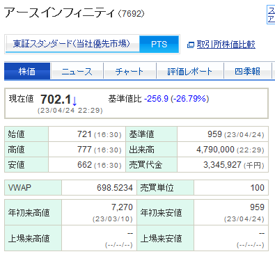 先週までは800円だったアースインフィニティすでに209円まで暴落です(((( ;゚д゚)))