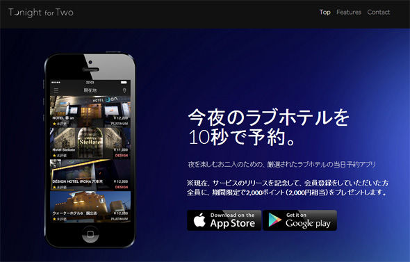 ホテル当日予約アプリ「Tonight」を展開するグリーは8月11日、ラブホテルの当日予約に特化した「Tonight for Two」(iPhone/Android)をリリースしました。スマートフォンから最短10秒で予約・決済が可能という手軽さが売りです。