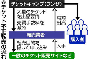 チケット転売サイトの最大手「チケットキャンプ(チケキャン)」を運営する「フンザ」(東京都渋谷区)が、大口の転売業者の出品手数料をゼロにしていたことが捜査関係者への取材でわかった。一般の出品者からは購入額の8・64%を手数料として徴収しており、大量出品する業者を特別に優遇していた。