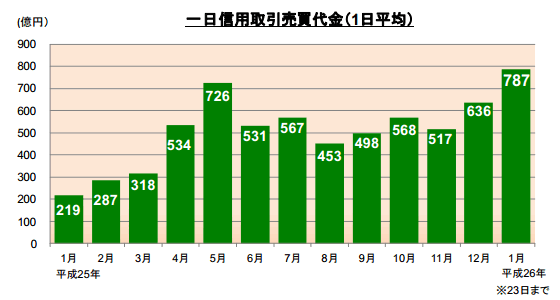 2013年1月よりサービスを開始した一日信用取引において、本日1月23日(木)の売買代金が1,000億円を突破し、過去最高を更新しました。本年1月における一日信用取引の1日平均売買代金は780億円を超え、現時点において、過去最高を記録した昨年5月の水準を上回っています。昨年12月にデイトレード向け銘柄ランキングを拡充し、一日信用取引でのデイトレードを手掛けやすくしたことに加え、本年1月14日より、TOPIX100構成銘柄の呼値の単位が縮小されたことが追い風となり、一日信用取引はますます盛り上がりを見せています。