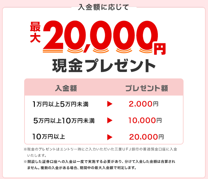 三菱UFJ銀行経由の証券口座開設+入金で最大20,000円プレゼントキャンペーン