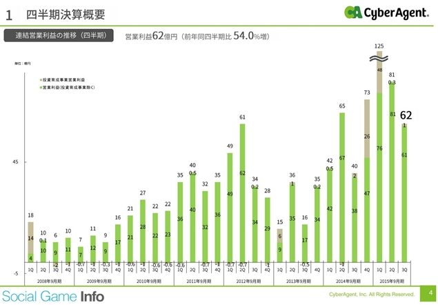 ¥µ¥¤¥Ð¡¼¥¨¡¼¥¸¥§¥ó¥È¤Ï1·î29Æü¡¢2015ǯ9·î´üÂè1»ÍȾ´ü¤Î·è»»¤òȯɽ¤·¤¿¡£Ï¢·ë¶ÈÀÓ¤ÎÇä¾å¹â¤Ï634²¯5100Ëü±ß¡ÊÁ°Ç¯Æ±´üÈæ45.1¡óÁý¡Ë¡¢±Ä¶ÈÍø±×¤Ï125²¯3500Ëü±ß¡ÊƱ194¡óÁý¡Ë¡¢·Ð¾ïÍø±×¤Ï126²¯9400Ëü±ß¡ÊƱ163.2¡óÁý¡Ë¡¢»ÍȾ´ü½ãÍø±×¤Ï63²¯6100Ëü±ß¡ÊƱ207.8¡óÁý¡Ë¤ÈÁý¼ýÁý±×¤Ç¡¢²áµîºÇ¹â¤ÎÇä¾å¹â¤È±Ä¶ÈÍø±×¤È¤Ê¤Ã¤¿¡£