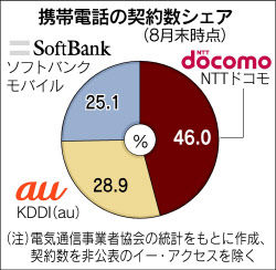 ある携帯メーカーの幹部がドコモとアップルが「販売ノルマは新規契約の4割」で大筋合意したと聞いたのはこの頃だ。「iPhone導入で3社が横並びとなったとき、中長期でどんな戦略を採るのか考えよ」。持ち株会社からドコモに内々でこんな指示も飛んだ。新型iPhoneが登場するのは今月20日。これまでドコモから顧客を奪う側だったKDDIやソフトバンクが、今後は顧客流出を防ぐ側に立場が変わる。携帯大手3社の競争環境は大きく様変わりする。